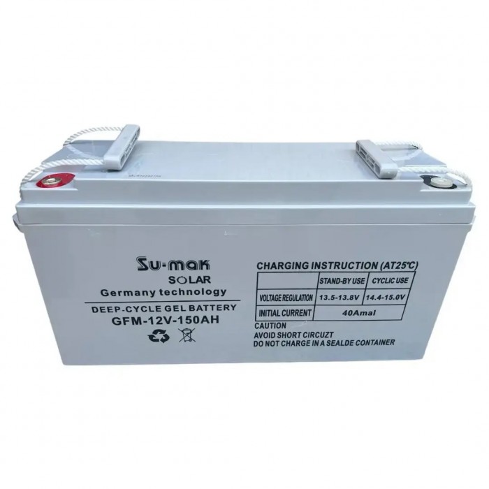 Гелева батарея Su-Mak відрізняється високою циклічною стійкістю, здатністю витримувати понад 500 повних циклів заряду та низьким рівнем саморозряду. Корпус із удароміцного пластику забезпечує захист від механічних пошкоджень та перегріву. Цей акумулятор ідеально підходить для сонячних станцій, джерел резервного живлення, човнів, катерів та автономних систем, де важлива надійність, безпека та довговічність.