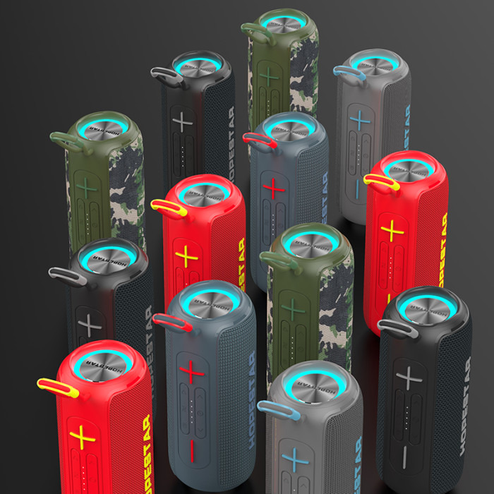 Це стильна і потужна колонка від бренду Hopestar з чудовим, насиченим звучанням. Її корпус виконаний з міцного пластику з покриттям Soft Touch, а лицьова частина і динаміки надійно захищені синтетичною тканиною, а кнопки управління прогумовані і натискаються з виразним клацанням. У задній частині акустика має приховані герметичною заглушкою роз'єми USB, microUSB, TF, AUX.