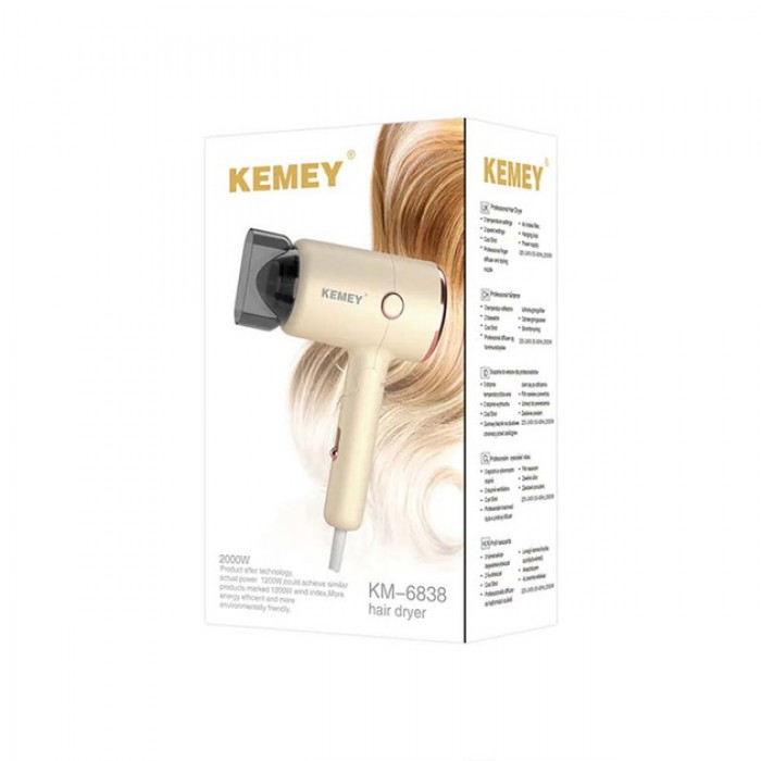 Фен для волосся Kemei KM-6838 - це високотехнологічний прилад, розроблений з урахуванням потреб професійних стилістів та перукарів. Професійний AC двигун змінного струму з тривалим терміном служби потужністю 1200 Вт забезпечує швидке сушіння волосся та ефективне укладання, тоді як іонізатор сприяє природному зволоженню волосся.
