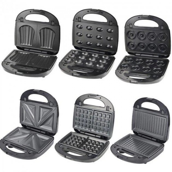 - Багатофункціональний пристрій із шістьма варіантами приготування: віденські вафлі, сендвічі, гриль, горішки, пончики та бельгійські вафлі.