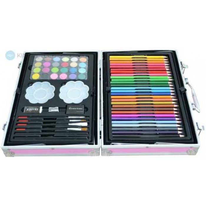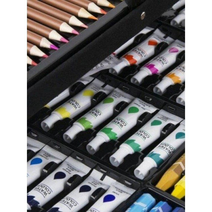 У ньому є 145 предметів на всі випадки: кілька видів олівців, фломастери, фарби, дитина зможе скуштувати всі стилі промальовування, при цьому ви не витратите