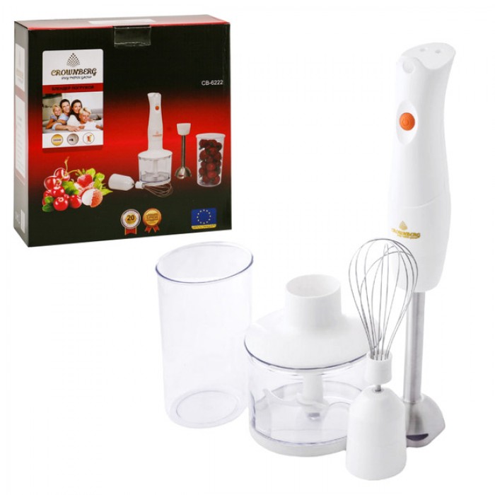Блендер Crownberg CB-6222 – настоящий агрегат, выполняющий множество функций, благодаря сменным насадкам. Идущий в комплекте венчик позволяет смешивать жидкие продукты, сбивать коктейли, безе и легкие муссы.