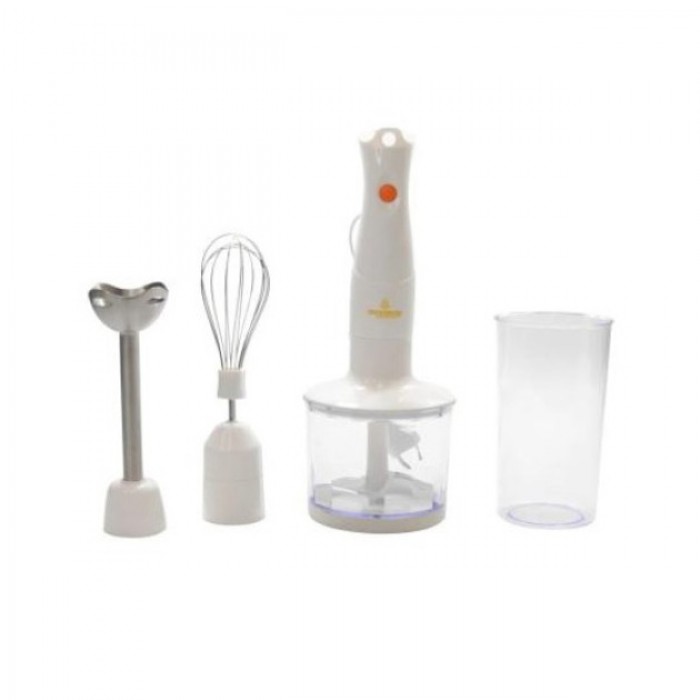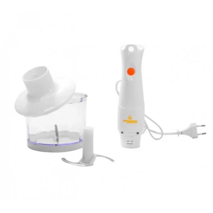 Блендер имеет компактные размеры, но имеет хорошую мощность в 300 Вт. Помимо моторной части в комплекте есть несколько насадок, чаша для измельчения овощей. Режущие детали измельчителя, венчик и погружная часть блендера выполнены из высококачественной нержавеющей стали.