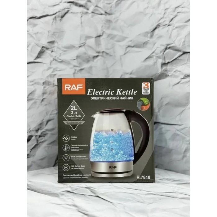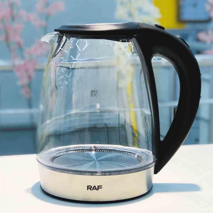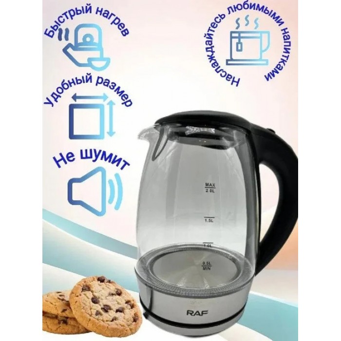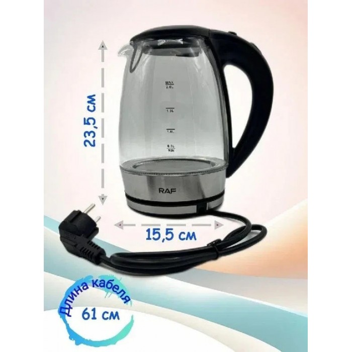 Вт и объемом 2 литра, он обеспечивает быстрый и удобный процесс кипячения воды. Корпус из высококачественного термостойкого стекла не влияет на полезные свойства воды и при этом позволяет наблюдать за захватывающим процессом кипения. Этот чайник также оснащен нейлоновым фильтром и закрытым нагревательным элементом. Преимущества: Термостойкое стекло: Корпус из термостойкого стекла сохраняет качество воды и обеспечивает визуальное наблюдение за процессом кипения. Нейлоновый фильтр: Встроенный нейлоновый фильтр помогает поддерживать чистоту напитка, улавливая частицы чая и другие примеси. Система Safe Work: Многоуровневая система защиты включает автоматическое отключение при закипании и при недостаточном уровне воды, обеспечивая безопасность использования. Яркая внутренняя подсветка: Придаст чайнику стильный и современный вид. Удобная кнопка открытия крышки: Делает эксплуатацию чайника более простой и интуитивно понятной. Разносторонние функции: Автоматический и ручной выключатель, вращающийся корпус на 360 градусов, скрытый нагревательный элемент, подключение через подставку и отсек для хранения шнура обеспечивают удобство использования и хранения. Двусторонняя шкала контроля уровня воды: Позволяет легко контролировать количество воды в чайнике. Характеристики: Производитель RAF Тип Электрический чайник Материал корпуса: стекло Тип управления: механическое Мощность: 2000 Вт Напряжение: 220-240 В Частота: 50/60 Гц Объем: 2 л Размер: 23.5*15.5 см