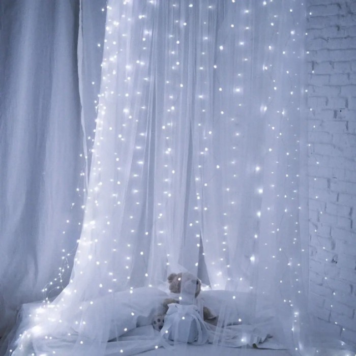 Интерьер, украшенный гирляндой конский хвост, смотрится фантастически. Тонкая проволока практически незаметна, и создается полное впечатление, что множество огоньков парит в воздухе.