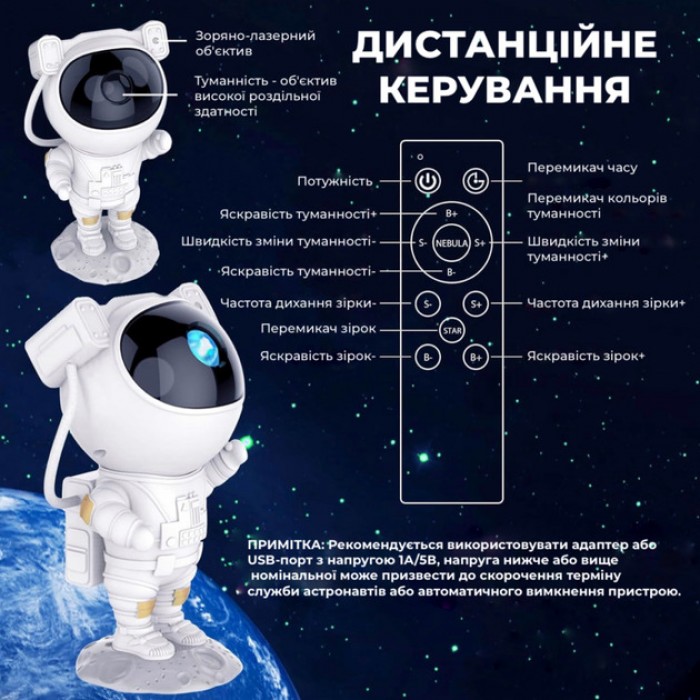Одним из главных преимуществ проектора является его подвижность. Вы можете придавать рукам астронавта разное положение и регулировать угол наклона головы. Таким образом Вы регулируете угол и направление проекции, поскольку проектировочная лампа расположена в шлеме космонавта.