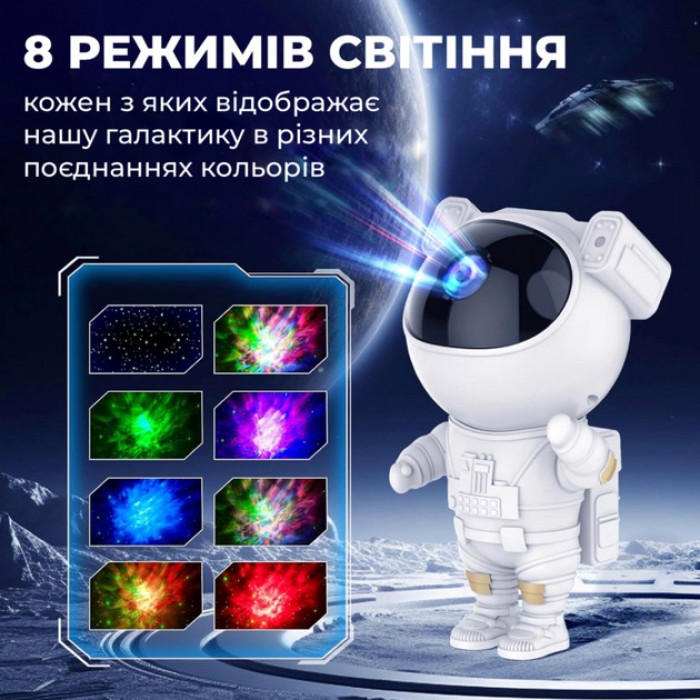 Лазерный проектор галактики Астронавт станет отличным ночником для юных покорителей космоса и одной из любимых игрушек! 8 ярких разноцветных картинок галактики оживят и украсят не только детскую, но и вечеринку, семейный просмотр кино или игровую комнату.
