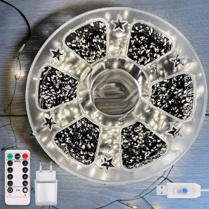 Эта светодиодная гирлянда длиной 50 м выполнена на зелёном проводе, оснащена 1 500 LED‑диодами и пультом дистанционного управления с 8 режимами световых эффектов. Питание — от сети 220 В (с возможностью USB‑подключения в некоторых версиях). Идеальна для праздничного декора: украшения ёлки, окон, фасадов, фотозон и др.