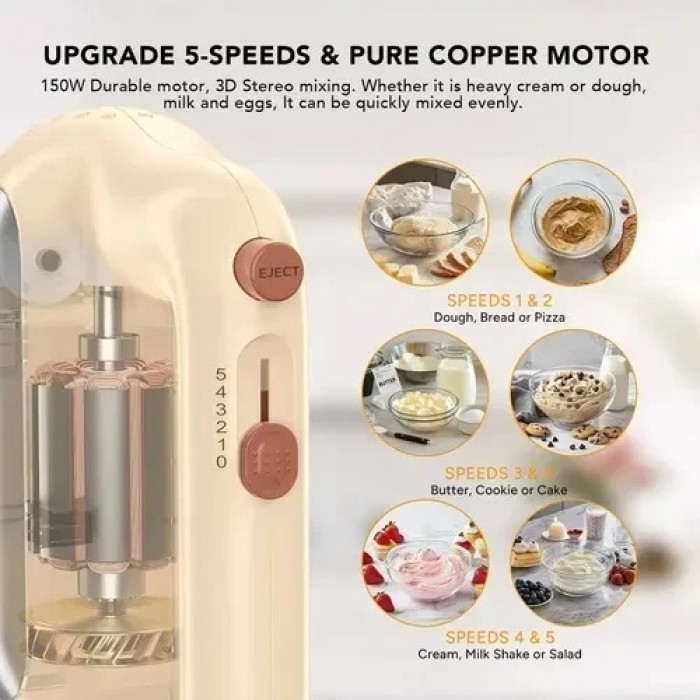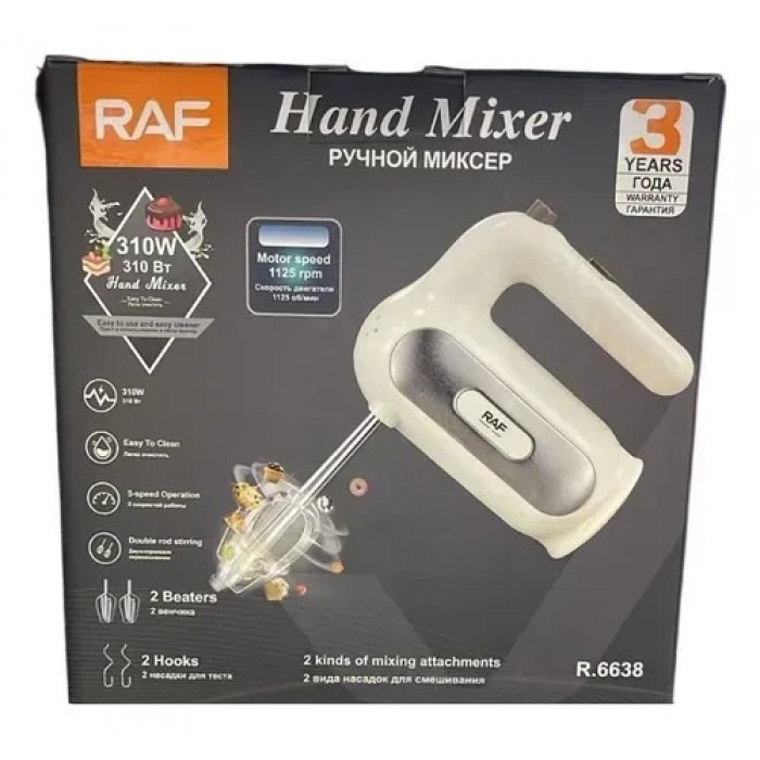 Ручной миксер относится к типу достаточно компактных, но очень мощных моделей с мотором максимальной мощностью 310 Вт. Этот прибор оборудован 5 скоростными режимами работы, позволяющими эффективно сбивать продукты разной плотности. В комплекте с миксером Вы найдете дополнительные крюки для затворения теста, которые по достоинству смогут оценить те хозяйки, которые любят радовать свою семью разными выпечками.