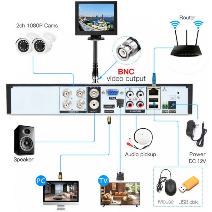 Работает система по следующему принципу: камеры подключаются к видеорегистратору и передают на него видеосигнал кабеля (входы BNC). Регистратор преобразует полученный сигнал изображения, сжимает и при необходимости записывает на жесткий диск (не входит в комплект).