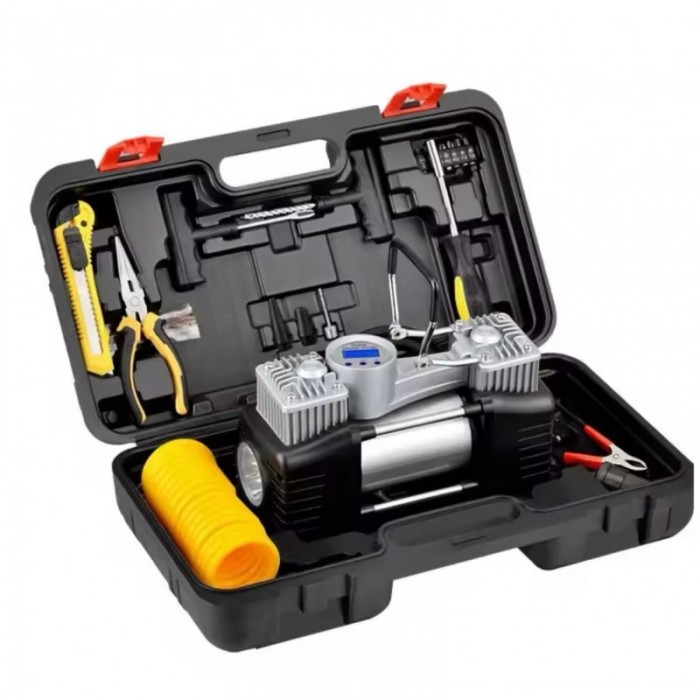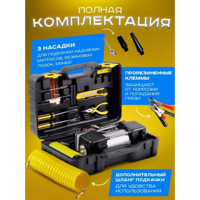 Автомобильный компрессор оснащен удобным ремнабором, включающим все необходимые инструменты для быстрой замены колеса на дороге.