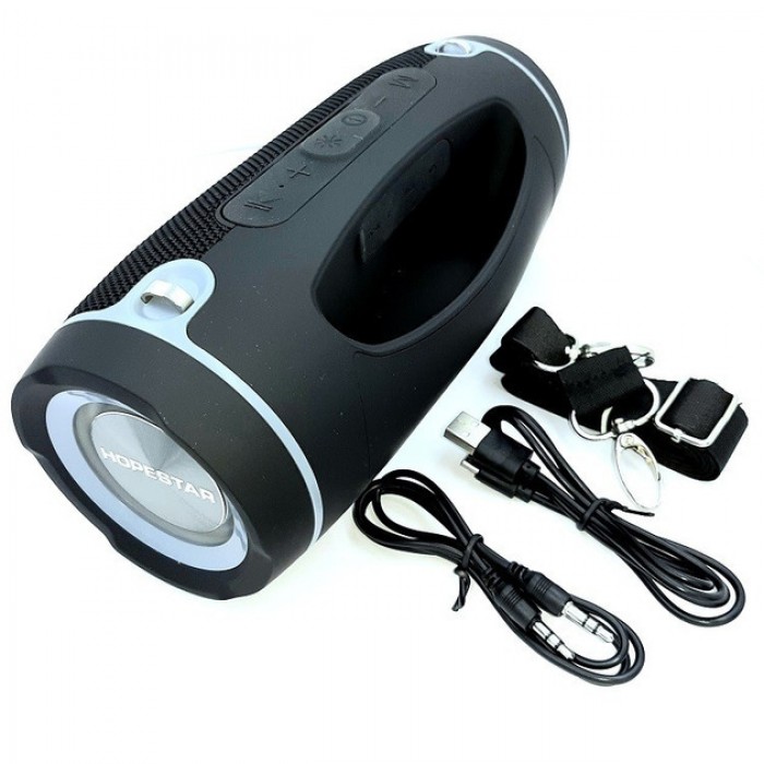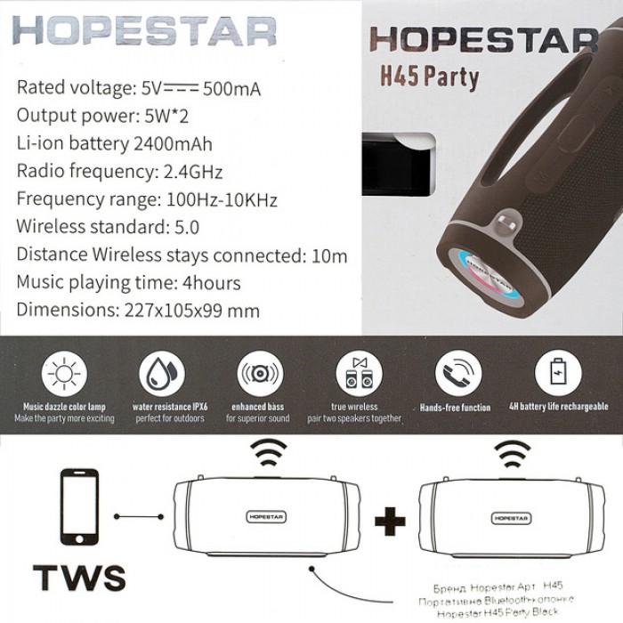Портативная bluetooth колонка HOPESTAR H45 Party – это оригинальный гаджет, со стильным современным дизайном, во влагозащищенном корпусе и с насыщенным звуком. В колонке разместилось 2 динамика по 5 Вт, издающие отличный звук, несмотря на весьма компактные размеры колонки.