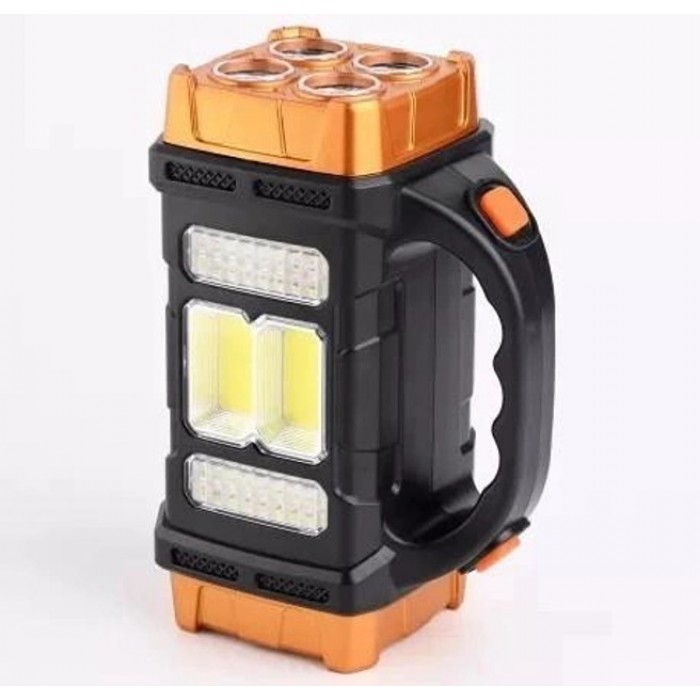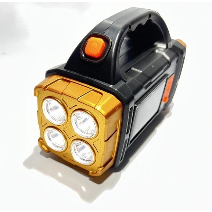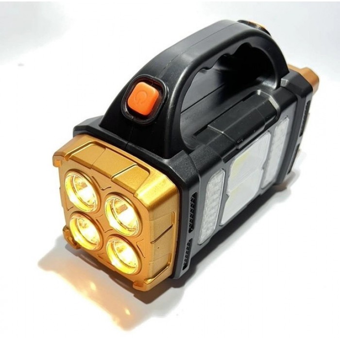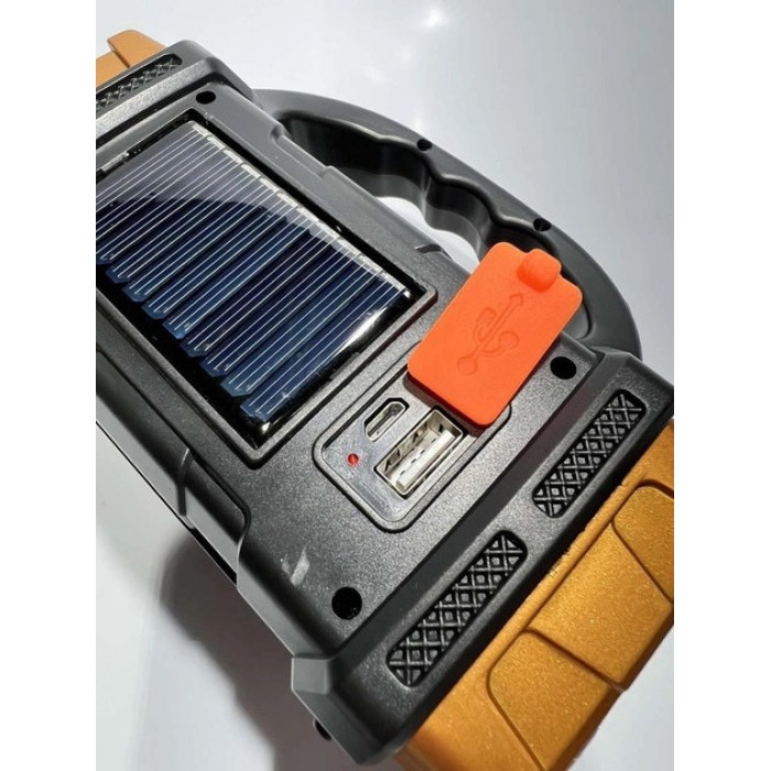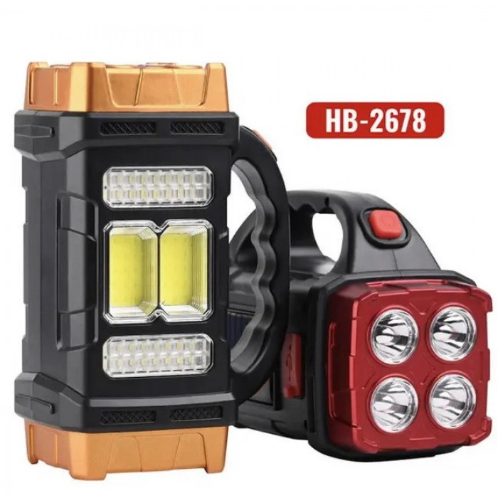 Переносной ручной аккумуляторный фонарь на солнечной батарее HB-2678-25W+2COB – это незаменимый многофункциональный гаджет. Имеет по 4 светодиода с трех сторон, что обеспечивает яркость 1000 люмен. На торцах размещено по 4 дальнобойных светодиода белого и желтого свечения. На боковой грани расположено 4 СИ светодиода светильника, которые рассеивают свет, идеально для освещения комнаты. Работает фонарь от встроенного 1500mAh аккумулятора, которого хватит до 8 часов свечения. Заряжается аккумулятор от любого USB-порта или солнечной панели от света. К тому же фонарь поддерживает функцию повербанка, от него можно зарядить телефон.
