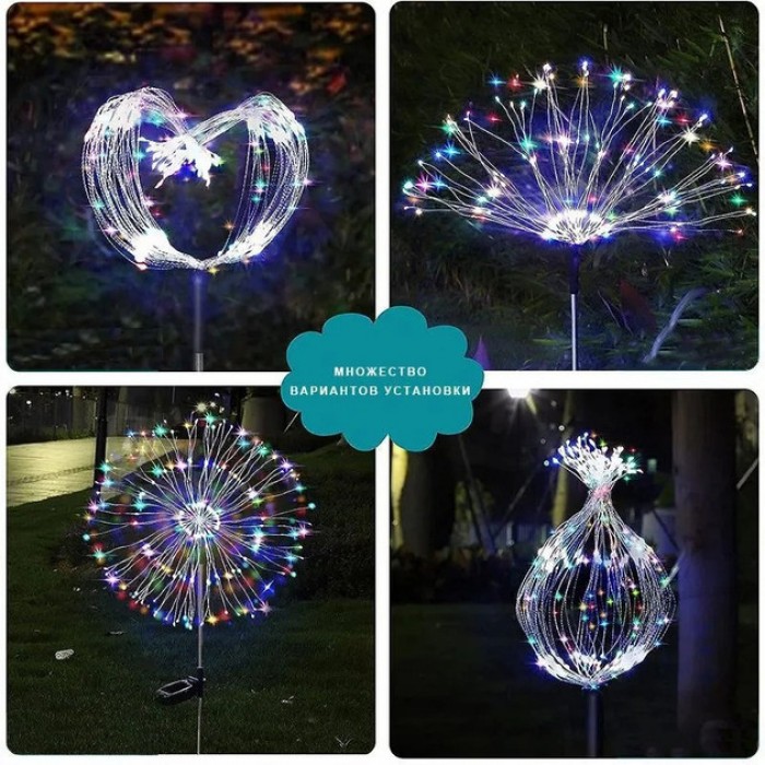 Использование беспроводной подсветки, питающейся от солнечной энергии, делает ее надежным и экономичным решением для освещения улицы, двора, входной площадки или беседки в ночное время суток. Также он может быть отличным декором вашей приусадебной территории во время праздника с фейерверком или салютом. К примеру, на новогодние праздники. Необычные фигуры разноцветных гирлянд создадут великолепный атмосферный стиль, подходящий к любому сезону и любой дачной площадке, грунтовой местности. Он оснащен стальной основой для наружной крепи, может быть использован для облагораживания цветников, клумбы или зеленого газона. Вы не останетесь равнодушными к этому наземному аксессуару, который переливается синими, красными, зелеными, розовыми, голубыми и фиолетовыми цветами. Этот декоративный садовый прибор на солнечной батарее с влагозащитным пластиковым корпусом – необходимый инвентарь стильного сада и отличный подарок для любого дачника. Большие светодиодные нити идеальны для создания красивых декораций на вашем участке. Они также могут использоваться для подсветки подъезда к вашему дому, насыщаясь энергией солнца целый день и обеспечив яркий свет ночью.