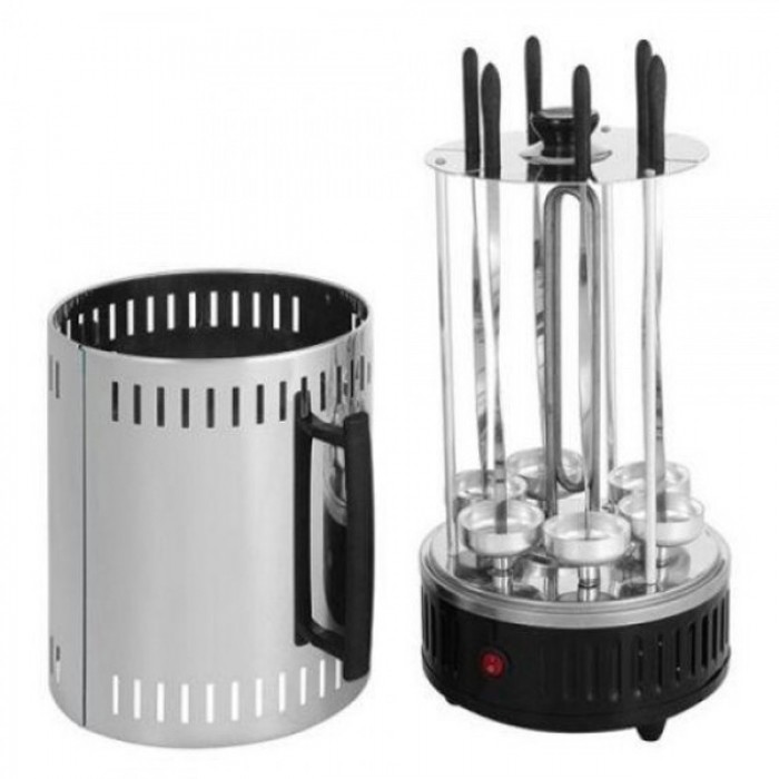 Электрическая шашлычница на 6 шампуров на 1000 Вт станет незаменимым кухонным прибором для воплощения кулинарных желаний – свиной, куриный, овощной шашлык, люля-кебаб и шашлык из морепродуктов – широкие возможности для украшения любого праздника. Электрическая шашлычница имеет цилиндрическую форму: в верхней части расположена жаровая камера, в нижней – привод шампуров. Шесть вращающихся шампуров с чашами для стекания жира и защитный кожух обеспечивают равномерное обжаривание шашлыка со всех сторон.