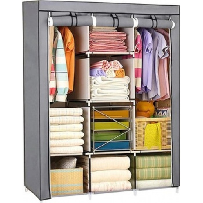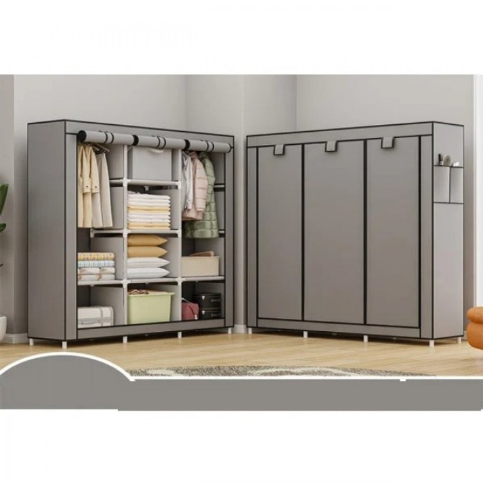 Шкаф 88130 текстильный, складной, на 3 секции, 130х45х170 см, серая стойкая сборная металлическая конструкция, которую по всему периметру натягивается тканевый чехол. Данный тканевый шкаф является отличным вариантом решения проблемы размещения вещей в арендованных квартирах, общежитиях, на дачах, потому что такой сборный шкаф легко транспортировать с места на место. Также в комплект входит 2 перекладины для вешалок-плечиков. Чехол изготовлен из нетканого материала спанбонд серого цвета. Основные характеристики шкафа: Каркас: металлические трубки+пластик. переходникиМатериал чехла: спанбондКомплектация: 2 штанги для плечиков, 8 полокШирина шкафа - 130 см.Глубина шкафа - 45 см.Высота шкафа - 170 см.Вес шкафа: 3,4 кг.Размер упаковки: 60х34х9 см8 сбор такой шкаф не составит особого труда. Упаковывается в картонную коробку 60х34х9 см.