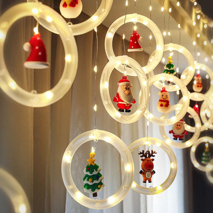 Новогодняя светодиодная гирлянда выполнена в виде больших колец с разным наполнением (Дед Мороз, Снеговик, Олень, Елка и др.). В каждом из колец несколько светодиодов, создающих праздничную атмосферу и наполняющих дом новогодним настроением.
