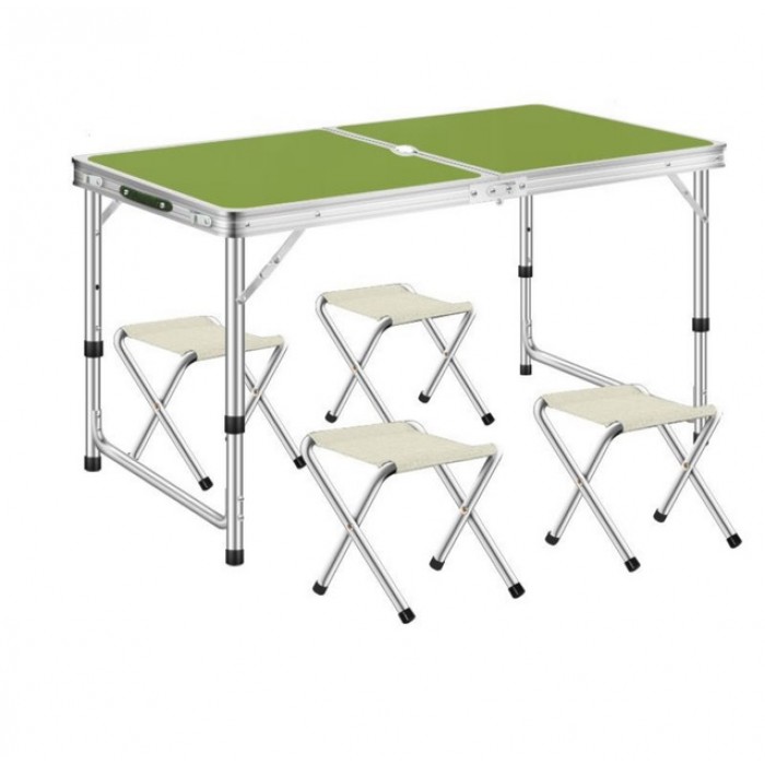 Стол для кемпинга имеет отверстие в центре столешницы для установки зонта, чтобы избежать складывания предусмотренных замков. Размер столешницы 120х60, высота от 55 до 70 см, размер стульев 31х32, высота 35 см.