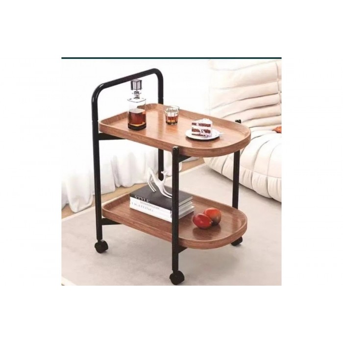 Столик (2-х ярусный) ZM‑1642 — Это компактный двухъярусный вспомогательный столик, предназначенный для использования рядом с диваном, креслом или в гостиной/спальне. Он состоит из металлического каркаса, окрашенного в тёмный цвет, и двух полок с деревянной или имитирующей деревянной отделкой. Верхняя полка выступает чуть дальше, нижняя чуть глубже, что создаёт визуально лёгкую структуру. Столик может быть оснащён роликами или ножками — что делает его удобным для перемещения и использования как сервировочного или бокового столика. Дизайн ориентирован на современный интерьер: минимум деталей, плавные формы полок с закруглёнными углами, сочетание металла и дерева, что создаёт лёгкое «лофт» или «индустриальное» настроение.
