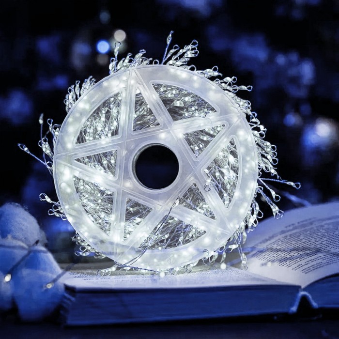 Гирлянда выполнена в виде мишуры с эффектом росы, что придаёт ей естественный и живописный вид. Гибкий белый провод позволяет легко формировать гирлянду в желаемую форму, будь то обвивка ёлки, украшение фасада дома или создание фотозоны.
