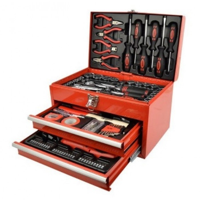 Универсальный профессиональный инструментальный набор в металлическом ящике с тремя выдвижными секциями. Предназначен для автосервиса, бытового и промышленного использования. Ящик включает в себя 168 предметов: отвертки, плоскогубцы, трещотки, головки, биты, шестигранники и другие необходимые инструменты.