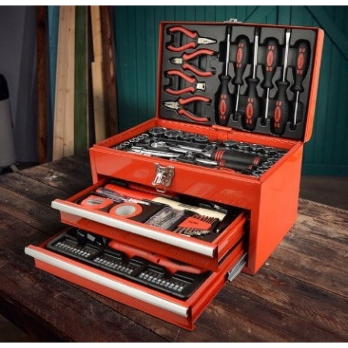 Компактный, но вместительный, ящик выполнен из прочного металла, окрашен в яркий красный цвет, устойчив к коррозии. Инструменты надёжно зафиксированы в формованных вкладышах — всё на своих местах и легко доступно.