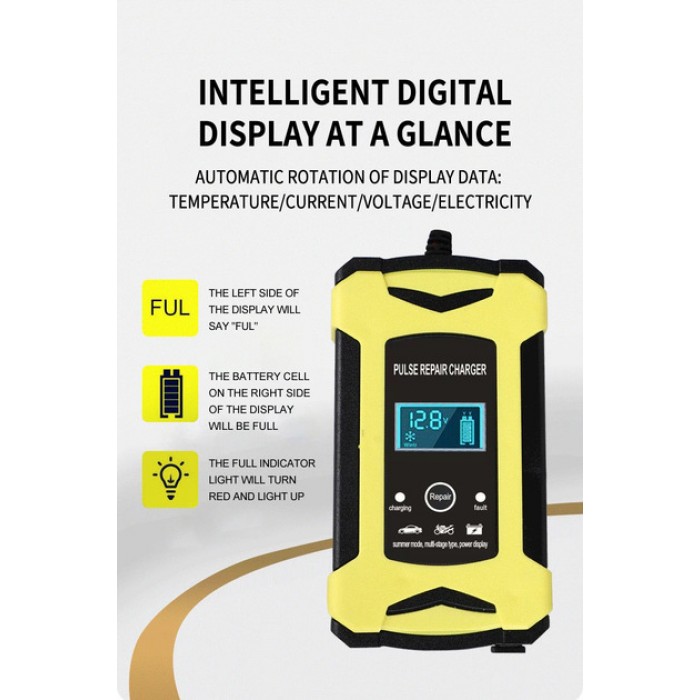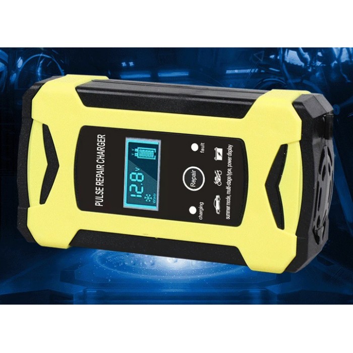 Зарядное устройство 12V мощностью 5 Ah для оловянно-кислотных аккумуляторов разных типов 4-100 Ah Интеллектуальное зарядное устройство для автомобильного аккумулятора в автоматическом режиме зарядит или восстановит аккумулятор. Процесс зарядки аккумулятора: Подключите зарядное устройство к розетке, подключите к клеммам аккумулятора, дождитесь окончания зарядки, на экране появится надпись "FUL". Типы аккумуляторов: Подходит для подзарядки большинства типов аккумуляторов автомобилей, мотоциклов от 4 Ач до 100 А час. Зарядное устройство имеет функцию "Летний режим" и "Зимний режим". Встроенный в корпус датчик измеряет температуру и автоматически подбирается зарядный вольтаж. На экране выводится информация об уровне заряда аккумулятора, напряжении, силе тока, температуре. Характеристики: Размер: 150x85x60 мм Напряжение: 12 В Типы батарей: большинство типов оловянно-кислотных батарей. Обнаружение напряжения: да Технология переключения: Да Защита полярности: Да Короткая защита: да Защита без подключения аккумулятора: Да Защита от перенапряжения: Да Защита от перегрева: Да Охлаждение: Вентилятор Входящее напряжение: 100-240 В переменного тока, 50-60 Гц: 52-60 Гц Минимальное начальное напряжение: 8,0 V Диапазон батарей: 4-100Ah Тепловая защита: 65'C +/-5'C