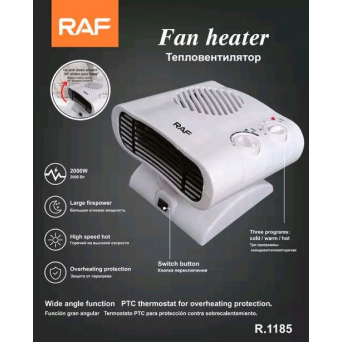 Тепловентилятор RAF 1185 – це вже модернізована «повітродувка», яка здатна повертатися на 90 градусів, при цьому не втрачаючи високих показників потужності, дуже компактна, проста та зручна в експлуатації, завдяки впровадженню нових технологій збільшується передача корисного об'єму повітря, що сприяє швидкого обігріву приміщення (при дотриманні правил експлуатації)
