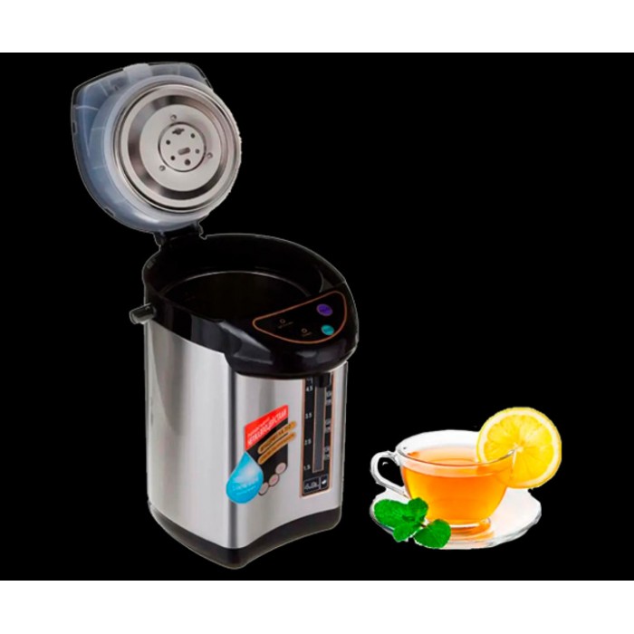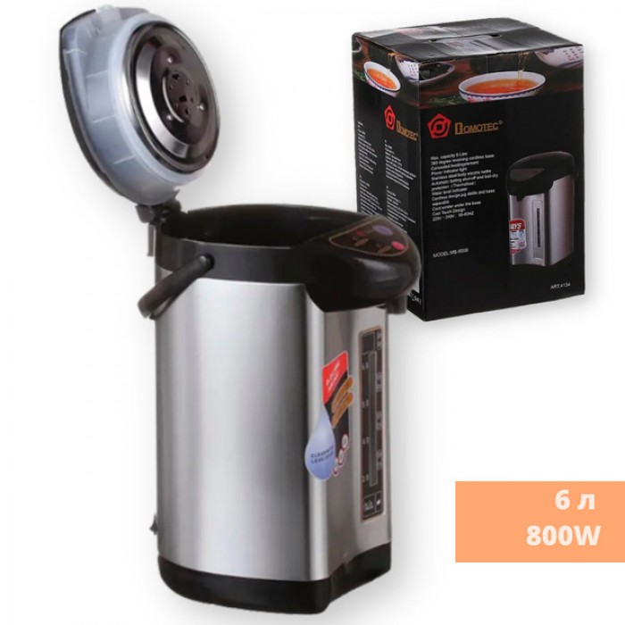 Термопот Domotec MS-6000 поєднує функції чайника і термоса: кип'ятить воду і надалі підтримує її температуру тривалий час. Подача води відбувається за допомогою помпи, накачуючи вручну необхідну кількість води. Завдяки чому його можна брати із собою, не переживаючи за наявність розетки під рукою.