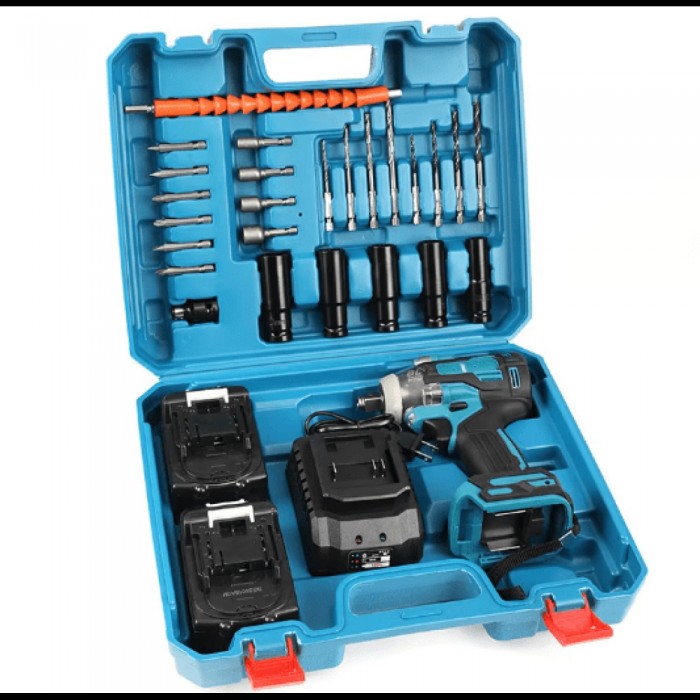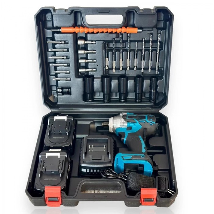 У комплект входять два акумулятори, зарядний пристрій, 18 додаткових аксесуарів та шість основних насадок (22, 21, 19, 18, 17, 14 мм), упакованих у зручний пластиковий кейс для безпечного перенесення та зберігання. Міцний корпус інструмента і кейс захищають від пошкоджень та зручні для транспортування.
